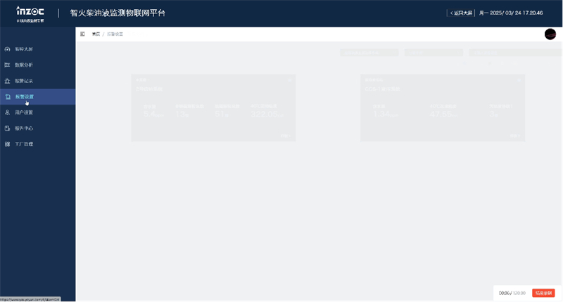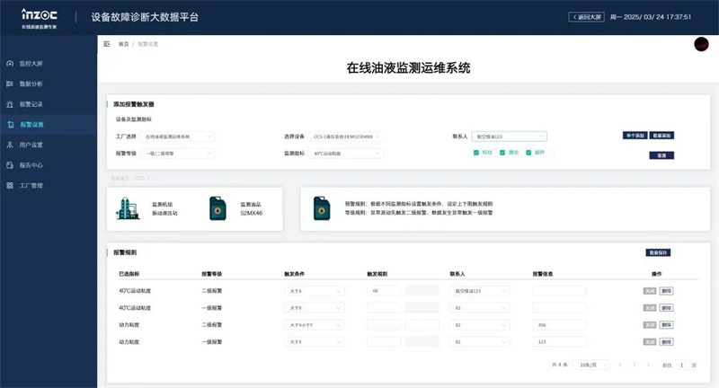 ■ 警報(bào)記錄與設(shè)置:在報(bào) 警記錄模塊可以查看設(shè)備歷史報(bào) 警信息。進(jìn)入報(bào) 警設(shè)置頁面可以根據(jù)不同監(jiān)測指標(biāo)設(shè)置觸發(fā)條件,設(shè)定上下限觸發(fā)規(guī)則,異常波動(dòng)先觸發(fā)二級報(bào) 警、數(shù)據(jù)發(fā)生異常觸發(fā)一級報(bào) 警,支持微信、信息、郵件等多通道預(yù)警。