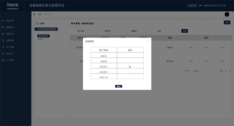 ■ 用戶設(shè)置權(quán)限分級:主要分為管理員、經(jīng)銷商、終端用戶、體驗(yàn)賬號(hào)、運(yùn)維人員五大賬戶類型,實(shí)現(xiàn)專機(jī)專管,靈活分配設(shè)備管理權(quán)限。