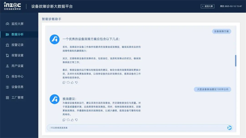 在數(shù)據(jù)分析詳情頁中,用戶可直接向“智能診斷助手”提出問題(如“齒輪箱磨損要點(diǎn)關(guān)注設(shè)備哪些狀態(tài)指標(biāo)?”),系統(tǒng)實(shí)時(shí)解析設(shè)備運(yùn)維專 業(yè)問題并生成結(jié)論。