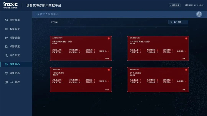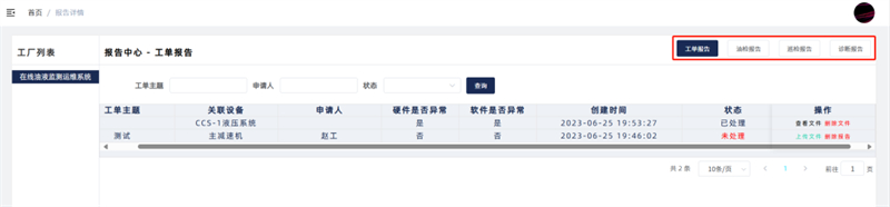 報(bào)告中 心 一級界面可總體預(yù)覽設(shè)備狀態(tài),二級界面深入結(jié)合工單記錄、油檢報(bào)告、巡檢報(bào)告、診斷報(bào)告四大核心模塊,構(gòu)建設(shè)備運(yùn)維全流程閉環(huán)管理體系。