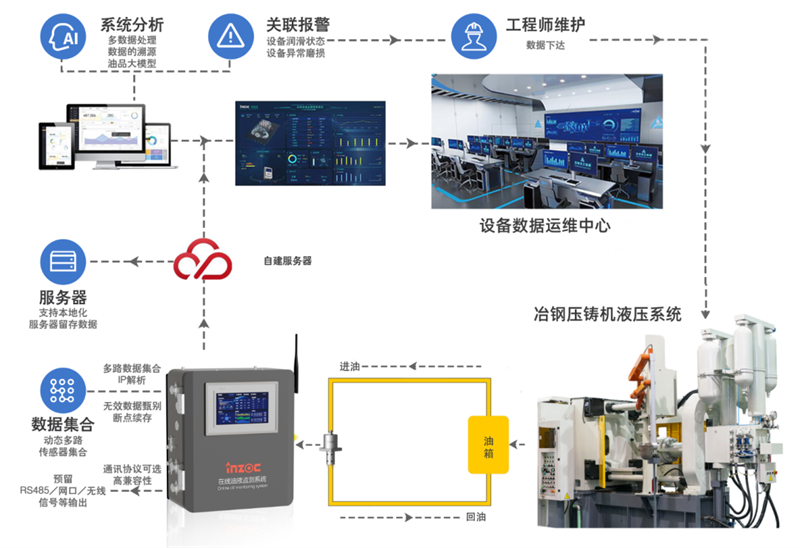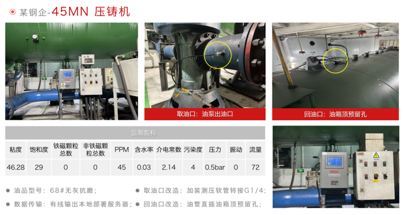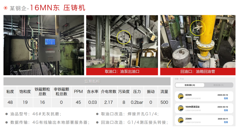該冶鋼廠部署的5臺智能在線油液監測系統,為壓鑄機液壓系統故障預警、預測性維護提供關鍵支撐,切實提升壓鑄機運行穩定性,降低非計劃停機風險,成為工業設備智能化運維的典型示范。