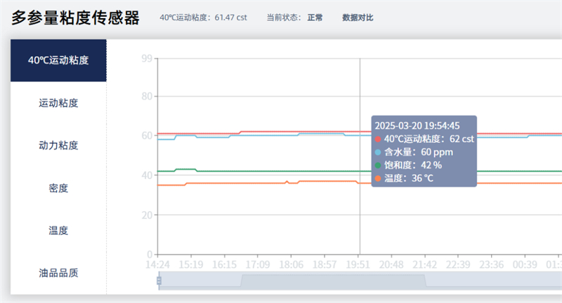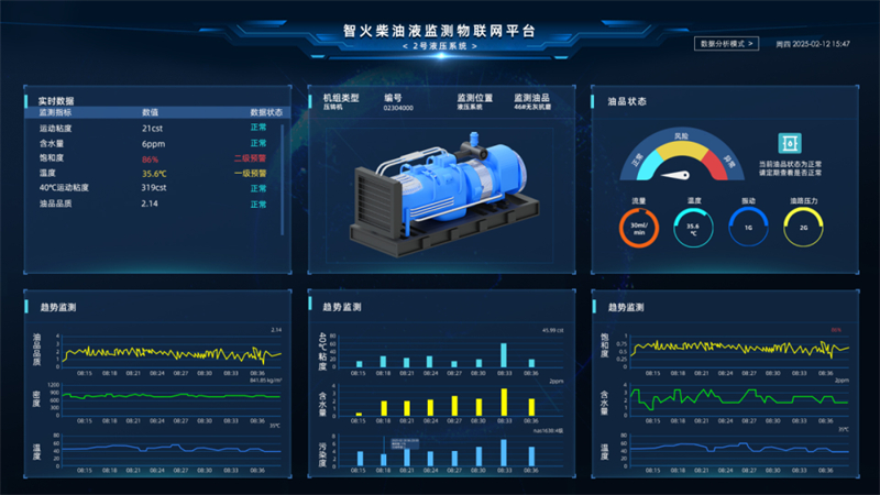 系統結合多角度數據,動態診斷油液健康度,針對 46# 無灰抗磨液壓油、68# 油等不同油品,系統實時抓取粘度、飽和度、鐵磁顆粒總數、非鐵磁顆粒總數、含水率、介電常數、污染度、壓力、振動、流量等核心參數,通過 4G 有線傳輸至本地服務器,實現數據實時集成。